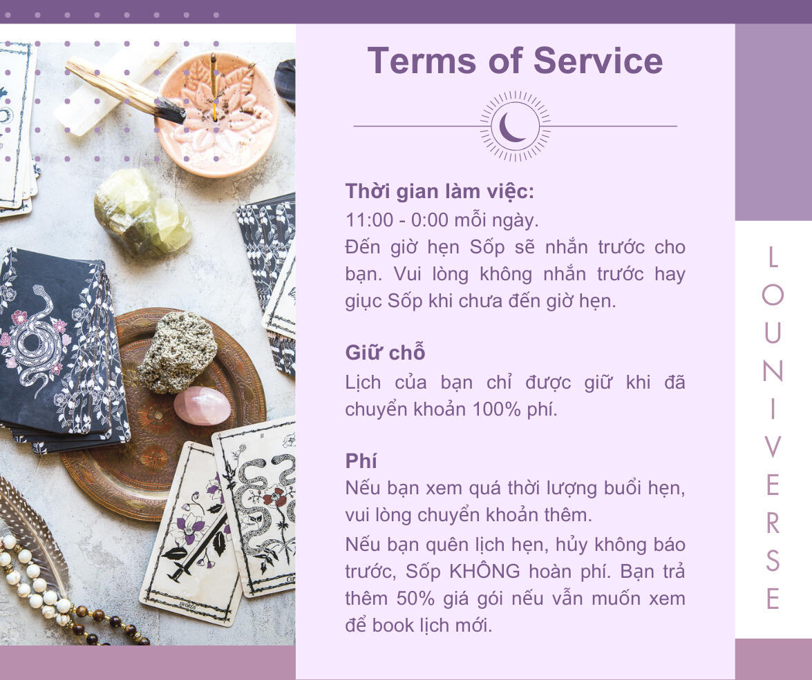 Lưu ý:Hình thức xem: nhắn tin trao đổi 1-1 như những người bạn. Nếu bạn muốn call audio hoặc video (xem live stream trải bài 1-1) bạn vui lòng trả thêm phụ phí 40% giá gói.Lưu ý: Giờ làm việc của Sốp là 11 giờ sáng tới 12h đêm giờ Việt Nam. Ngoài thời gian này, nếu muốn xem bạn cần book gấp thì giá gói sẽ x2, áp dụng với tất cả các gói xem trong web này.