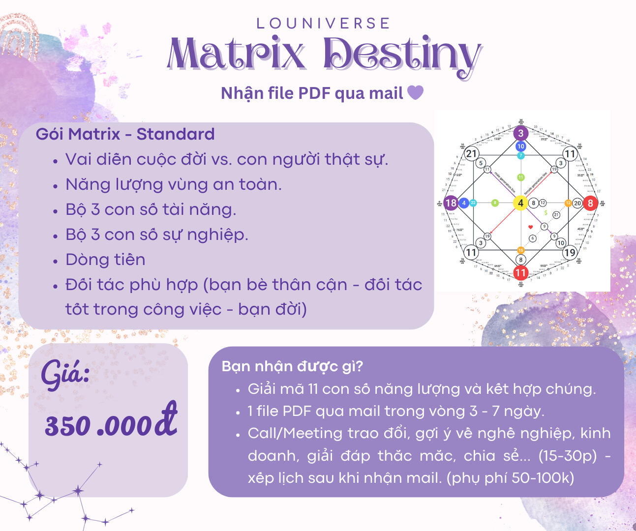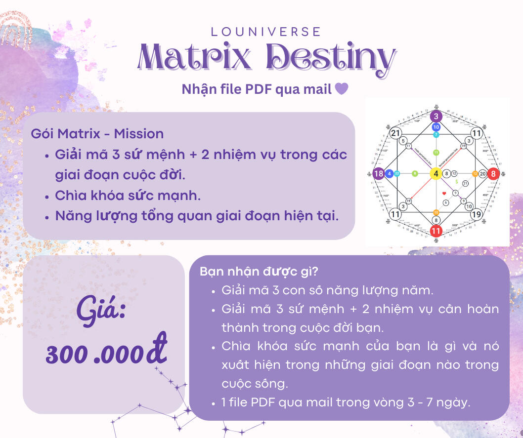 Matrix Destiny chart là một biểu đồ được tạo thành từ những con số ngày-tháng-năm sinh của bạn. Từ ma trận này bạn có thể hiểu được rõ nét hơn về bản thân mình, cách để trở thành phiên bản tốt hơn của bạn, ngành nghề phù hợp, câu chuyện tình yêu, thậm chí cả tiền kiếp...