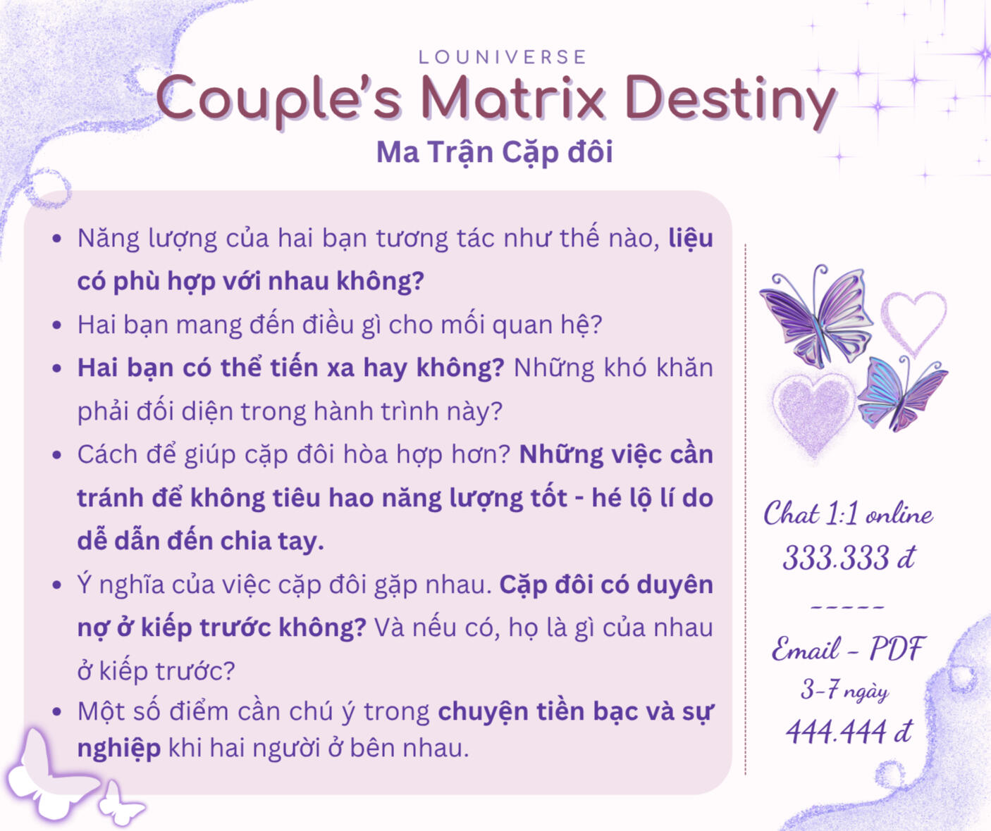 COUPLE'S MATRIX DESTINY là gói Ma trận dành cho các cặp đôi muốn cải thiện mối quan hệ và đi đường dài. Gói này sẽ hiệu quả nhất khi bạn book cùng gói Ma trận cá nhân (Standard) hoặc đã xem trước đó.