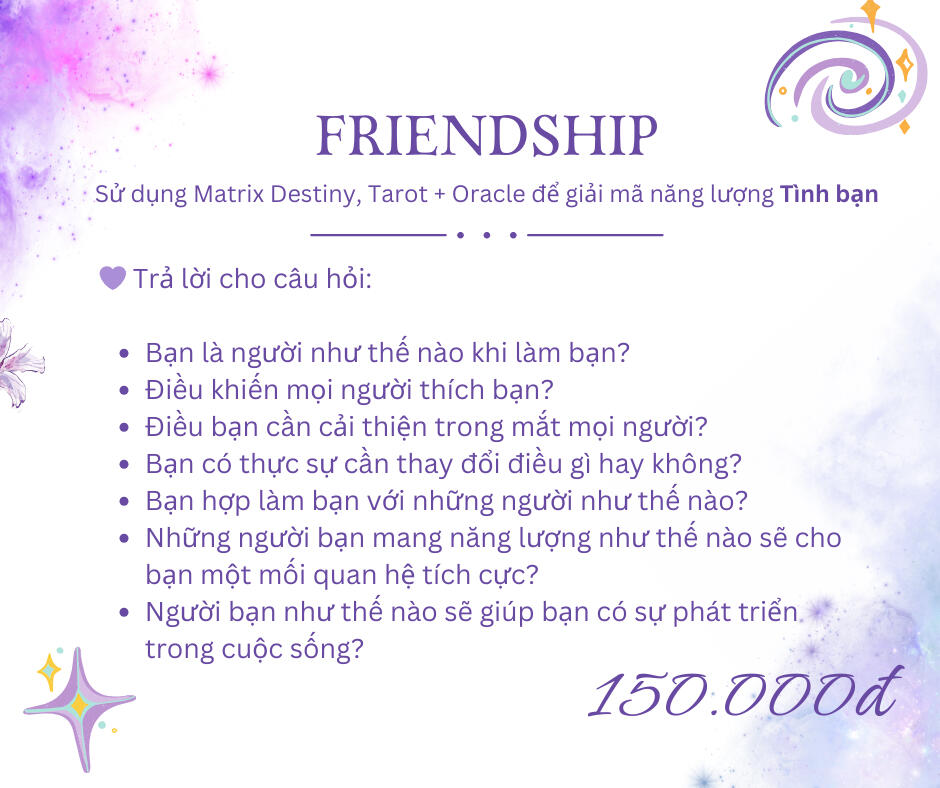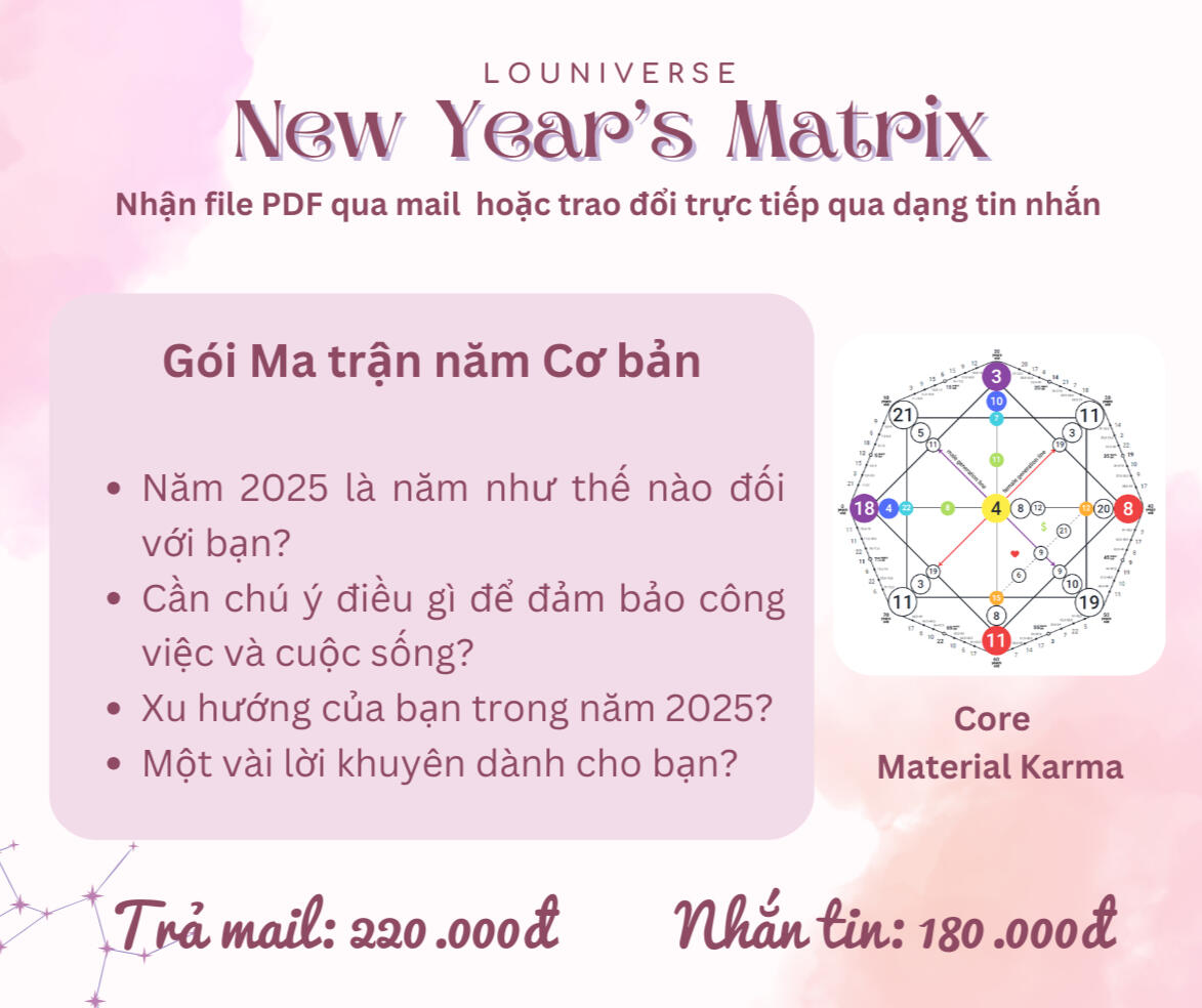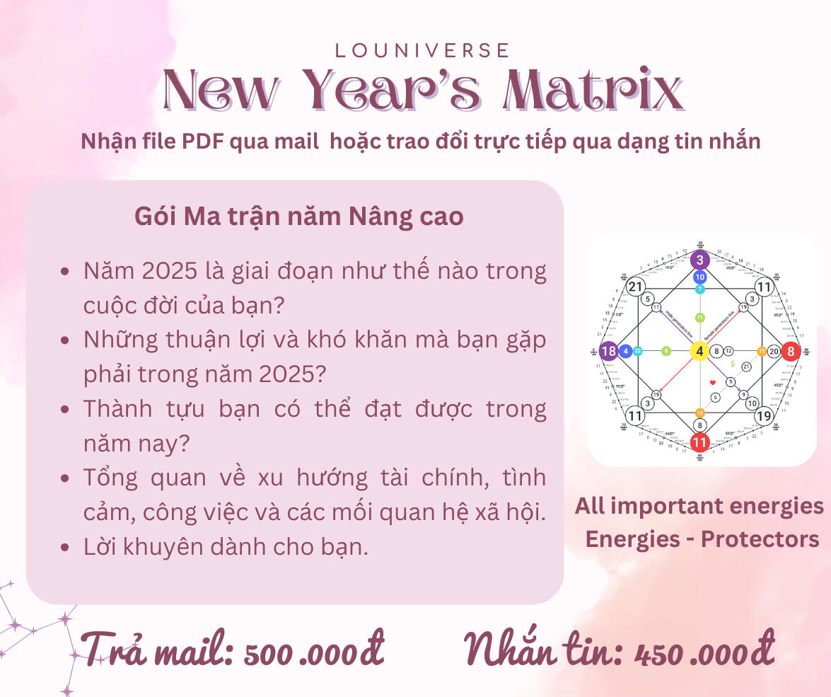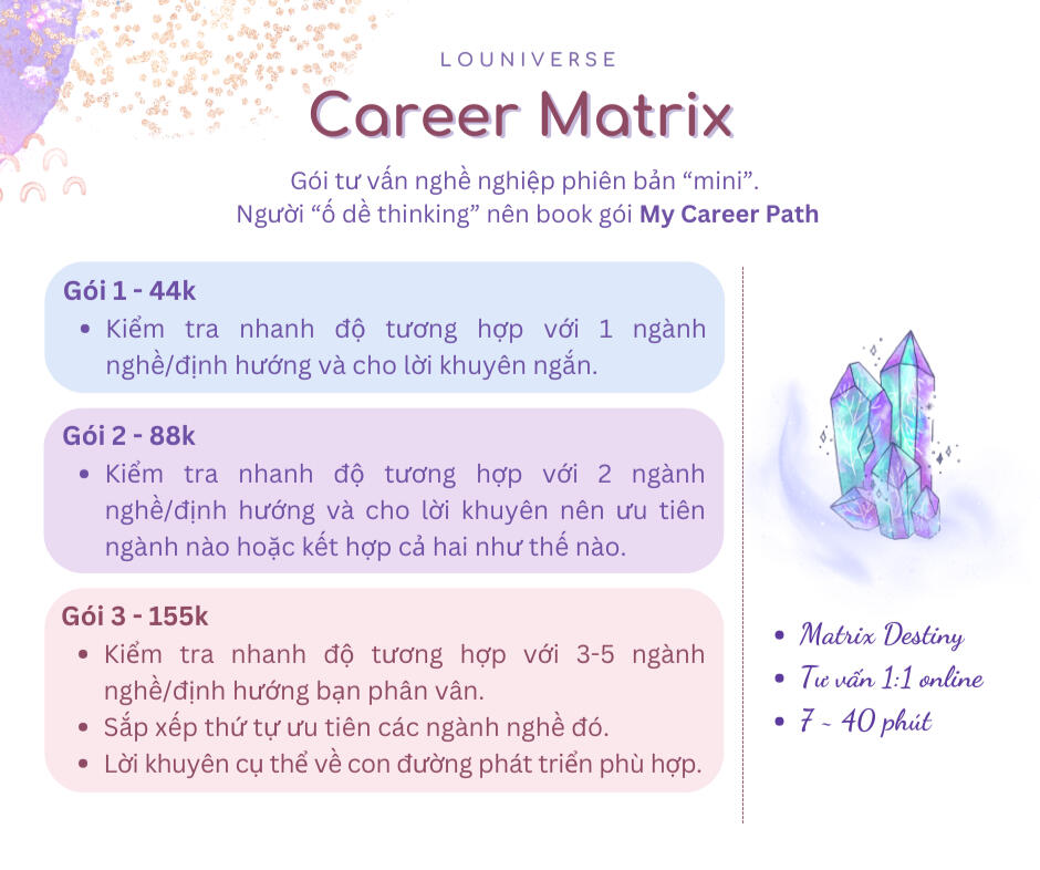 *Lưu ý: Nếu bạn không muốn đợi chờ và không cần trả mail, bạn có thể xem gói qua meeting online (+20% giá gói - không áp dụng với gói matrix cặp đôi) hoặc chat trực tiếp 1:1.